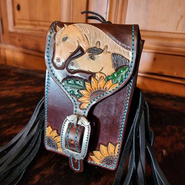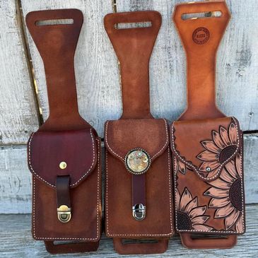 Our saddle satchels are hand crafted to meet your specific needs. These are made to hold your phone with a bit extra space for others small items. These are our tie on styles saddle satchels that are intended to be more versatile than our loop through style. Tie them on your saddle horn, back cinch rigging, or even your belt.